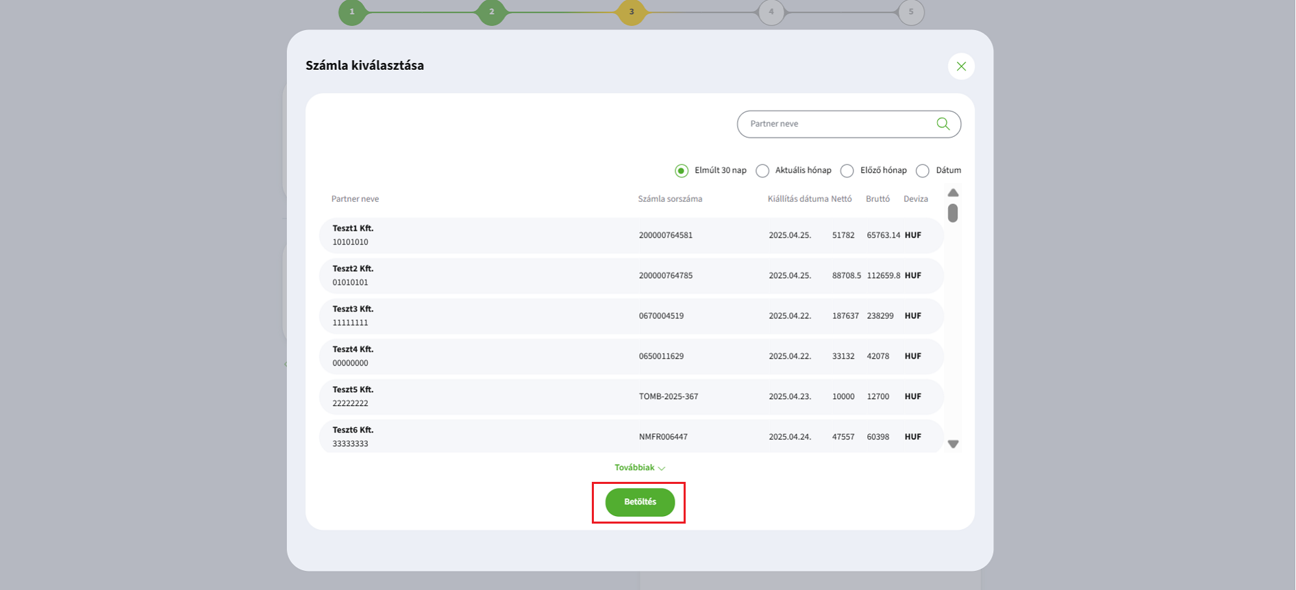 Ekkor megjelenik az összes NAV-ból lekért bejövő számlád. Válaszd ki a megfelelőt, majd kattints a „Betöltés” gombra, hogy annak adatai betöltődjenek.
